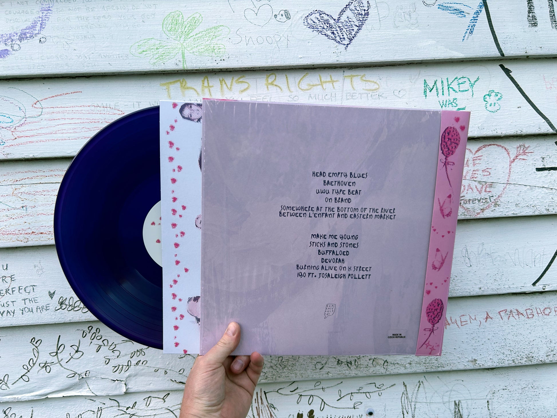 pink balloons opener “head empty blues” specifically bites back against the terrors of the normative male gaze that dominates so much of American culture. Over a post-punk passage that plays call and response with a wall of harsh noise, frontwoman Jael Holzman belts playfully morbid details of the head-exploding anxieties that haunt her daily: “is it bon eye-ver or bon iver? / i don’t care / i’ve got stalkers outside / not going out tonight / gonna sit and take pics / in my underwear.”