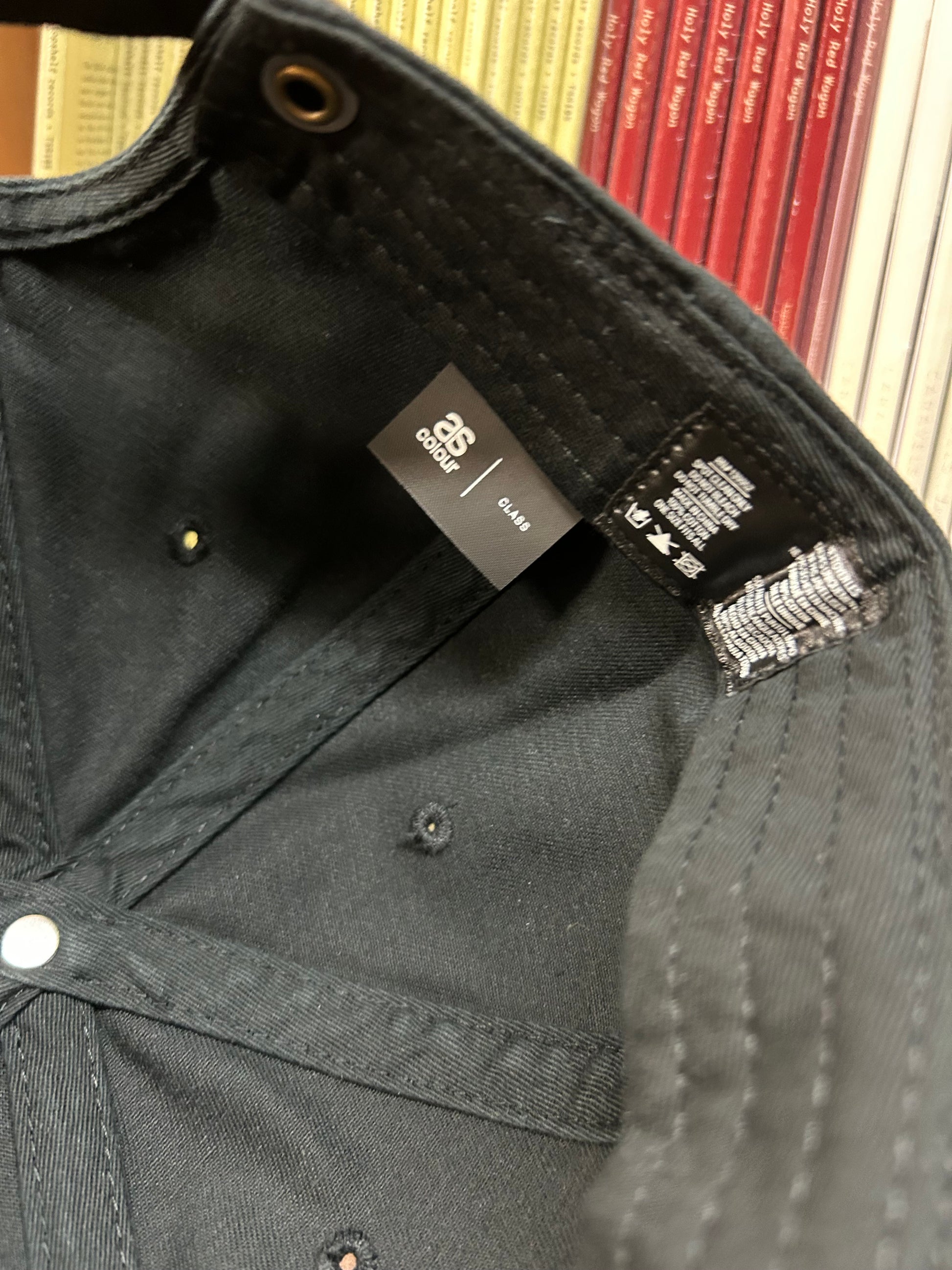 black AS Colours brand 6-panel "class" hat with "elephant gym" embroidered in beige thread on the front. Has a brass clasp to adjust sizing.