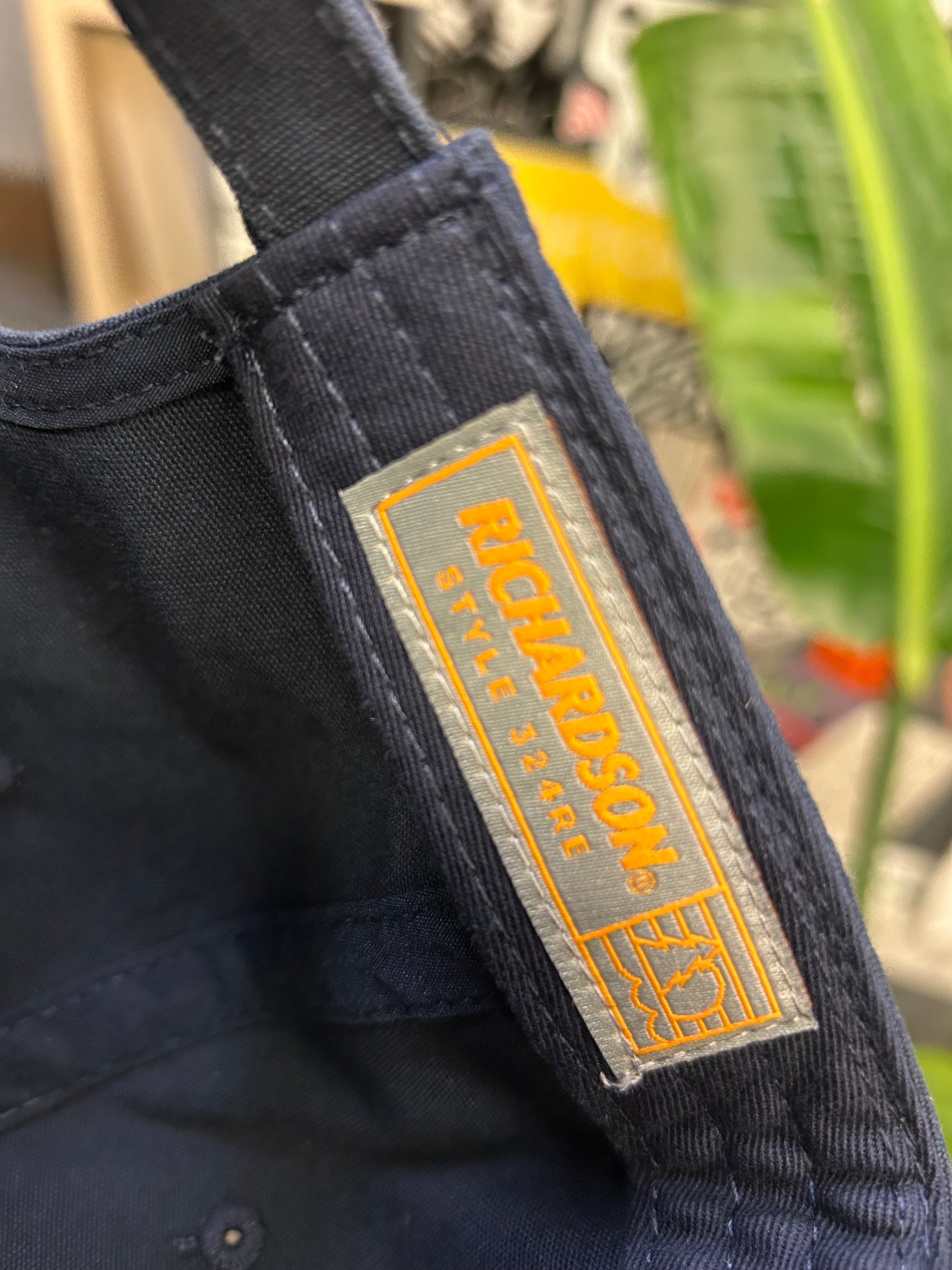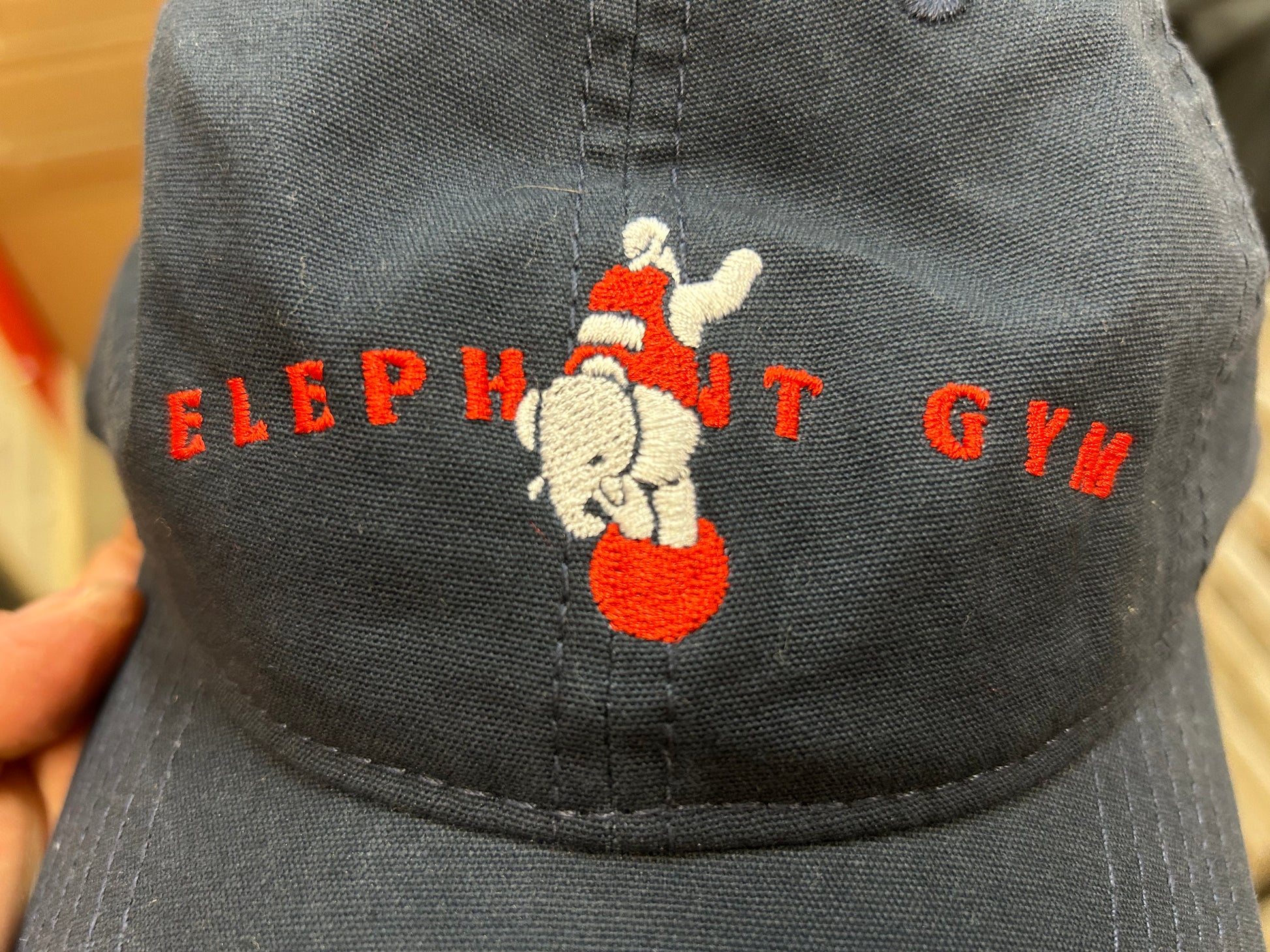 Navy blue Richardson brand 6-panel "class" hat with "elephant gym" and the elephant balancing on ball logo embroidered in white and red thread on the front. Has a brass clasp to adjust sizing.
