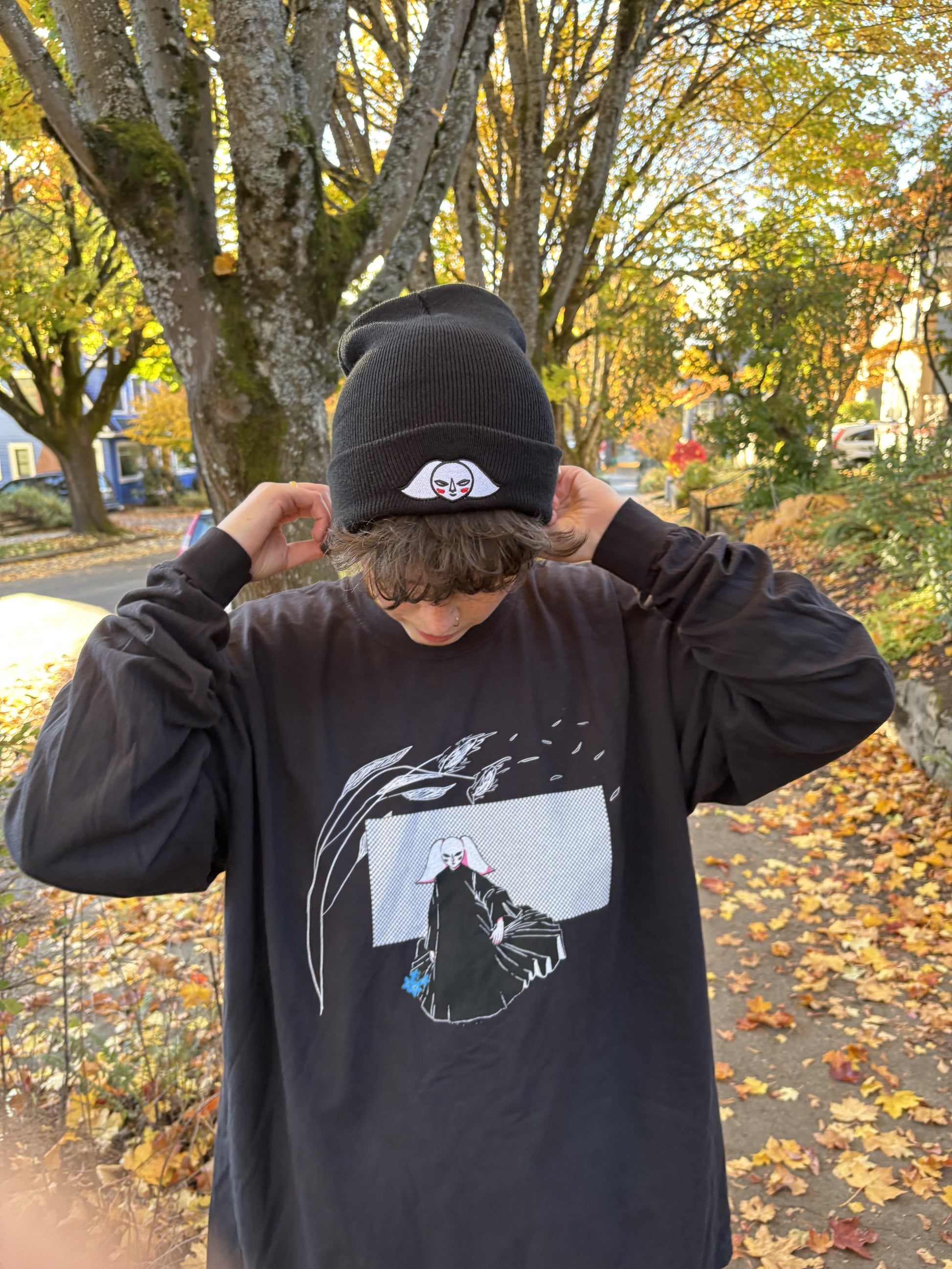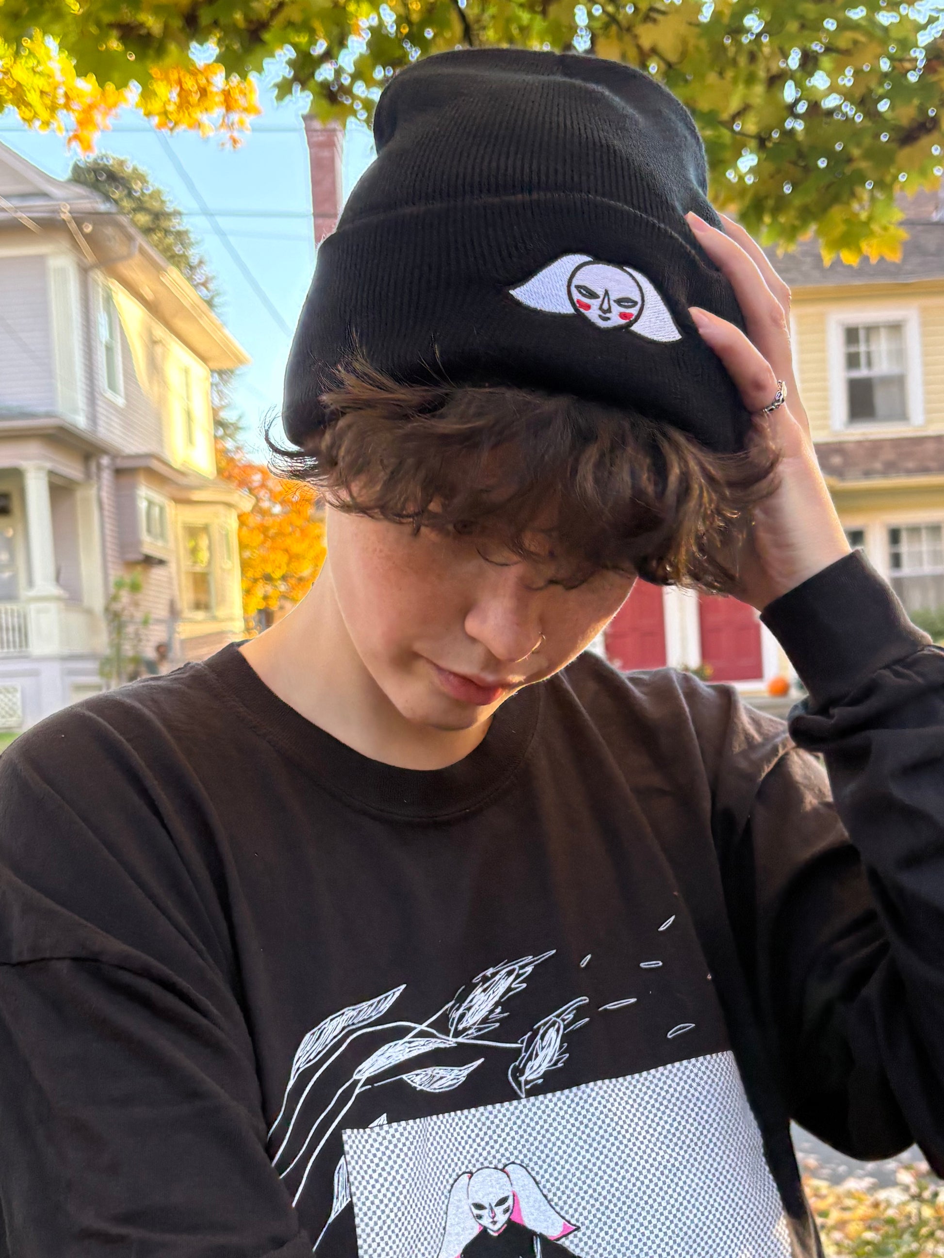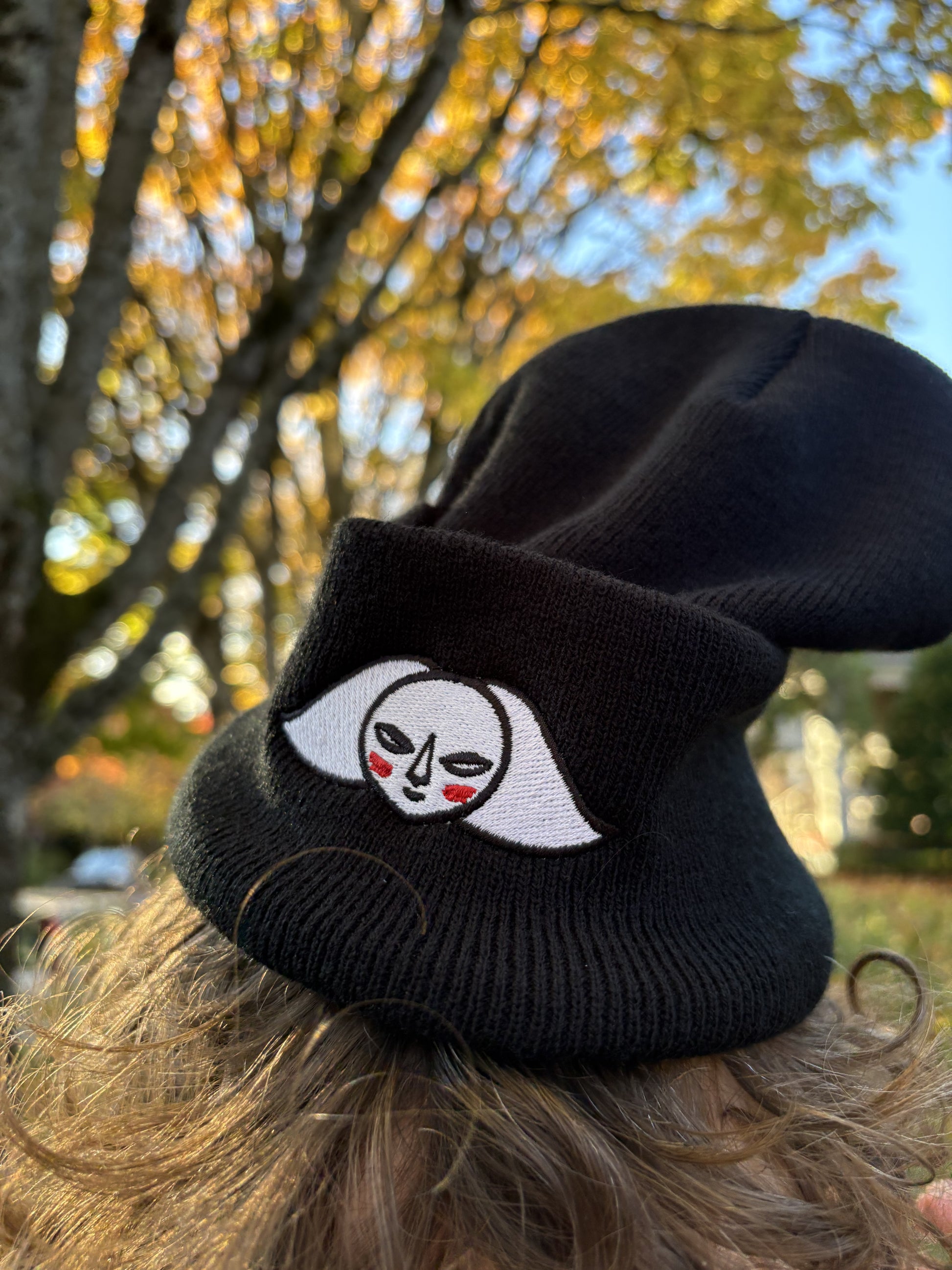 100% soft-touch acrylic tuque featuring an embroidered illustration of Mio, drawn by Sputnik. Available in black or lavender.